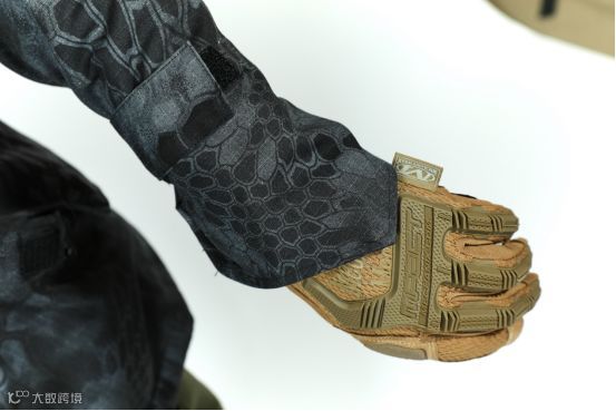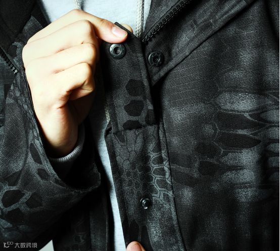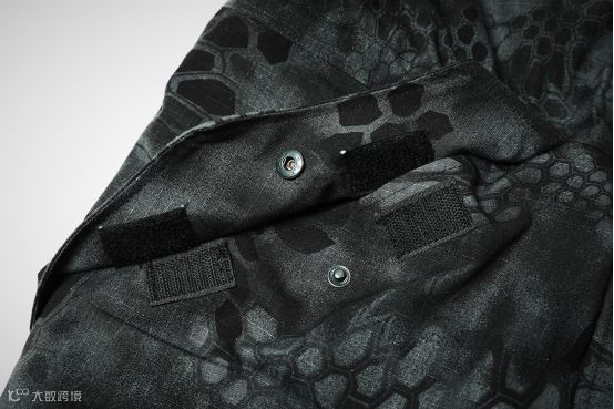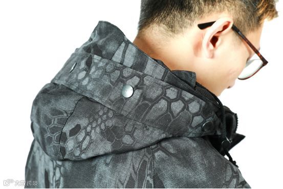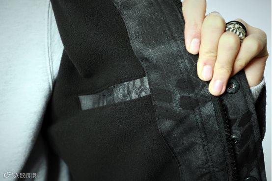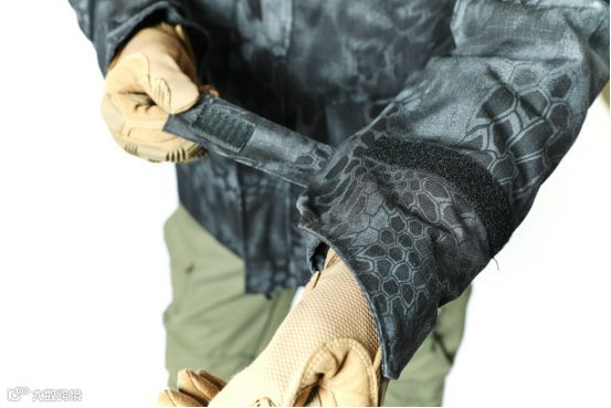 除了可以自由调节松紧程度外,抓绒蟒纹迷彩冲锋衣的袖口采用了与常见衣服完全不同的马蹄形袖口。马蹄袖是满族传统服饰,十分适合骑猎时使用,可以为手部提供额外的保护,甚至可以充当半个手套。抓绒蟒纹迷彩冲锋衣的马蹄袖口也可以起到同样的效果,为使用者提供更多的保护。