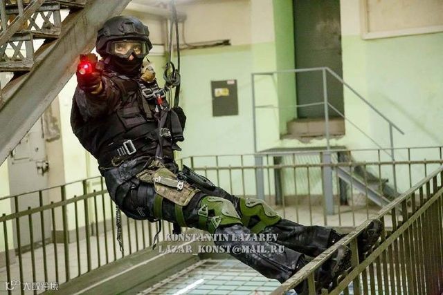 有趣的是,毛子们还想玩个骚操作--在监狱里玩绳降(拜托大哥你们才是主人啊,为啥要做出一个突击的感觉)。绳降的士兵不仅使用的是格洛克手枪,还安装了激光瞄准器,十分酷炫,也很贴合室内近战的主题。