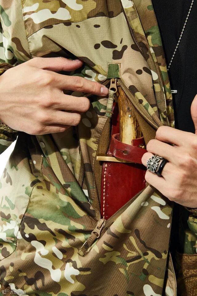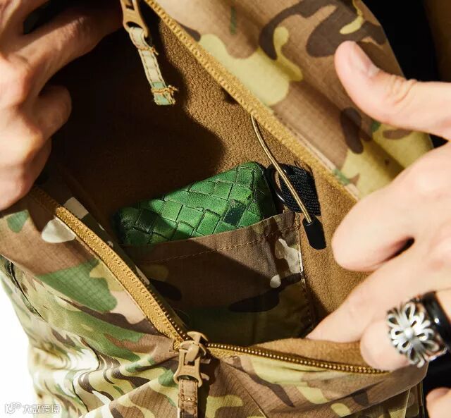 胸袋有羊毛内衬。在寒冷的冬天,棉服上有这样温暖的口袋,我们就可以把冻僵的手藏进去,让自己暖和起来。除此之外,这些口袋除了调整的弹力绳还有D型环等附件,还有一个尼龙口袋,可以用来放手机
