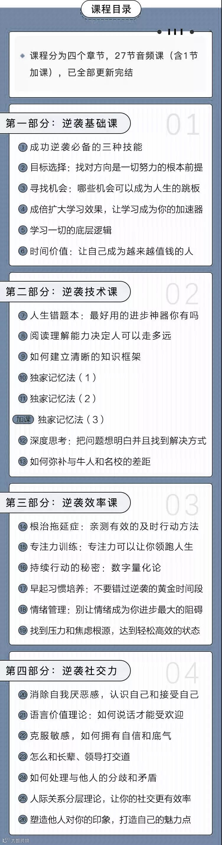 答:本音频共27节音频,每节课程30分钟左右,非常适合周末时、假期时、下课后收听学习。