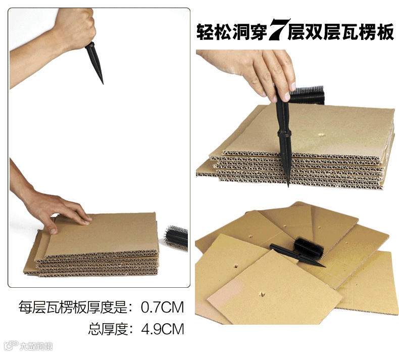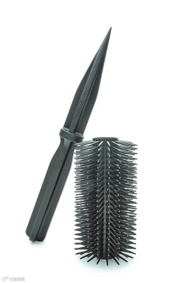 该梳子使用了塑钢材质生产,四面开槽的设计保证了其威慑力和威力。可以看到,一个成年人可以使用该梳子轻松洞穿7层瓦楞纸。