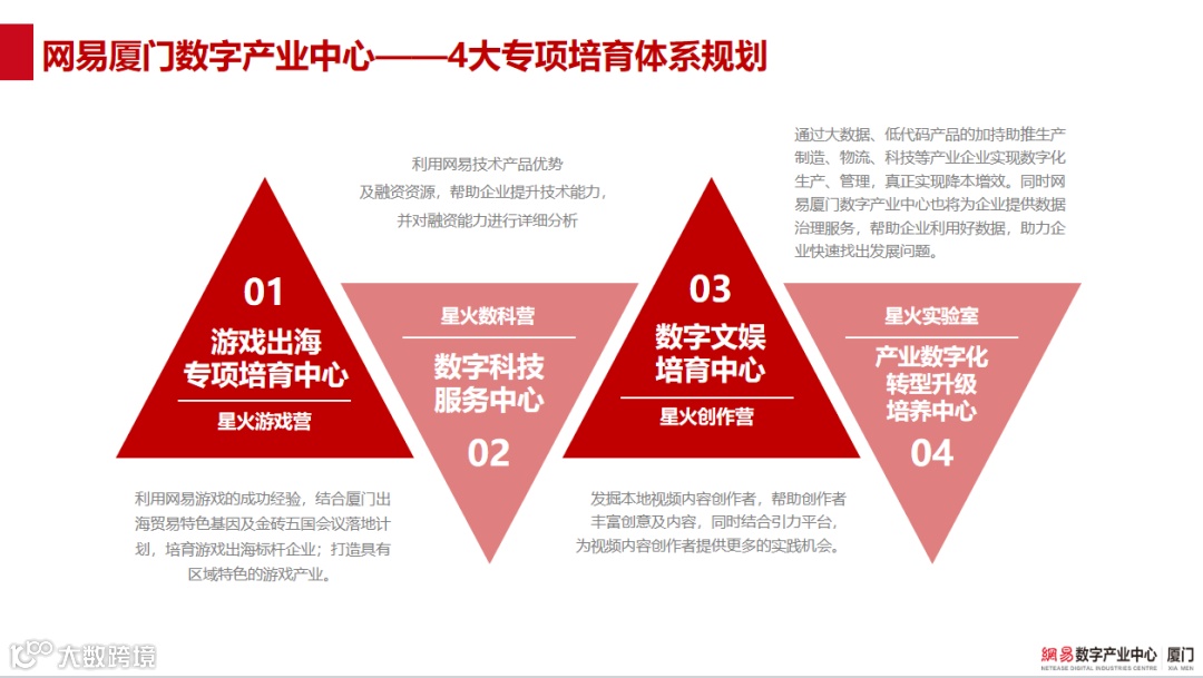 网易数字产业中心是网易数创旗下的数字产业载体之一,是网易产品、技术、培育、市场、生态等优势资源对外输出赋能的窗口,是将网易20多年所积累的互联网领域实践探索运用于行业创新培育、赋能,引导建设集集“培育-加速”一体化的企业成长服务平台。网易厦门数字产业中心(以下简称“网易厦门”)于2020年10月落地美峰创谷园区,目前已进入第三运营年度,属于厦门火炬高新区与同安区共同扶持项目。是基于网易多年来积累的创新经验、技术能力和运营资源,结合厦门产业特色和政策优势,合作开展产业培育赋能。