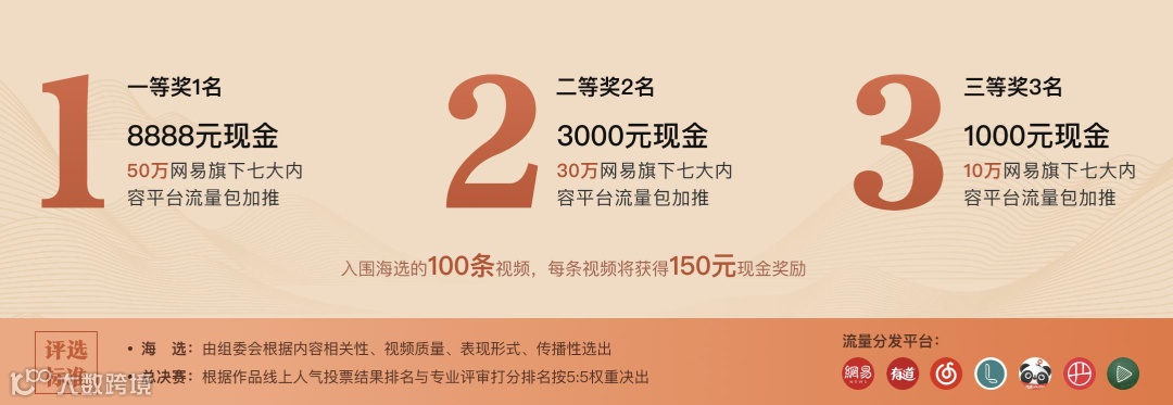 获得1000元现金奖励+10W网易旗下七大内容平台流量包加推(入围海选的100条视频,每条视频都将获得150元现金奖励)