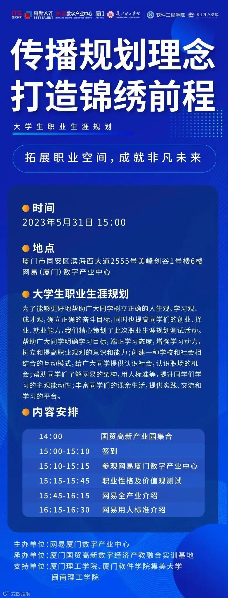5月31日,网易厦门数字产业中心,将携手厦门国贸高新数字经济产教融合实训基地、厦门理工学院、厦门软件学院、集美大学、闽南理工学院联合开展“传播规划理念,打造锦绣前程,拓展职业空间,成就非凡未来”主题活动。
