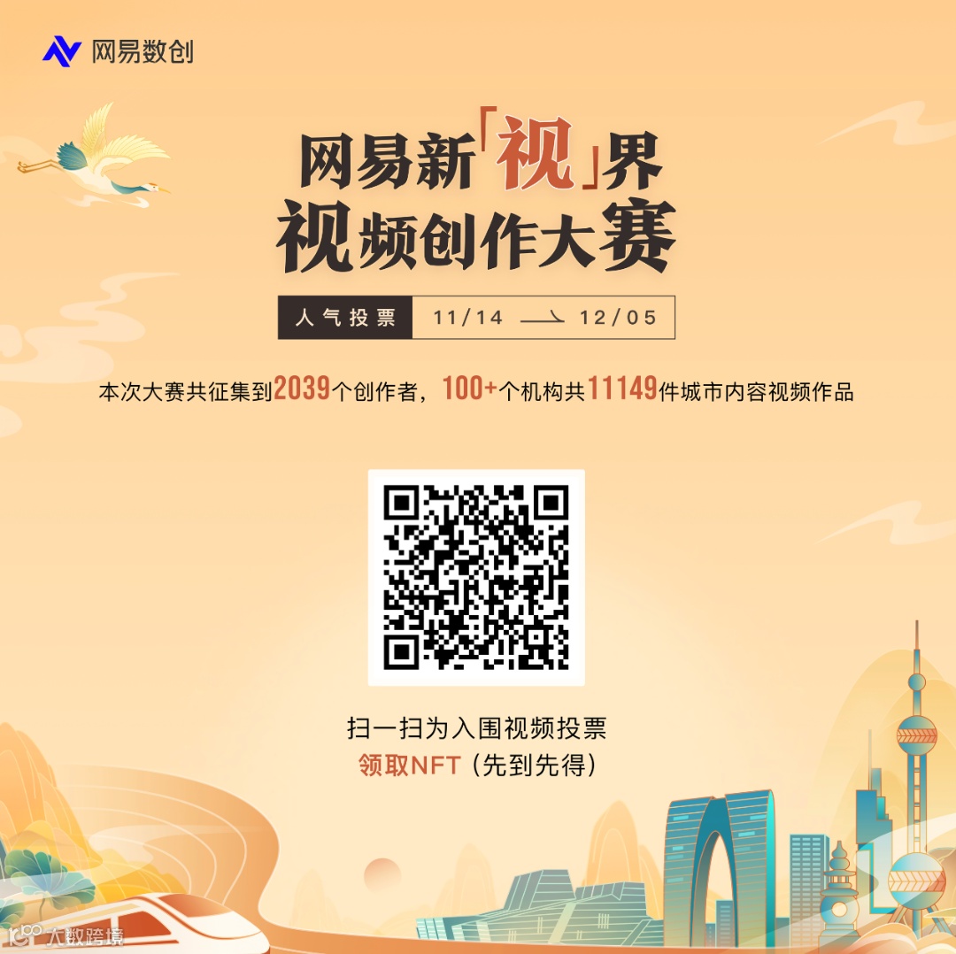 11月14日,由网易数创主办的首届网易新“视”界视频创作大赛正式进入票选阶段,3款大赛主题数字藏品也将正式对外发行。