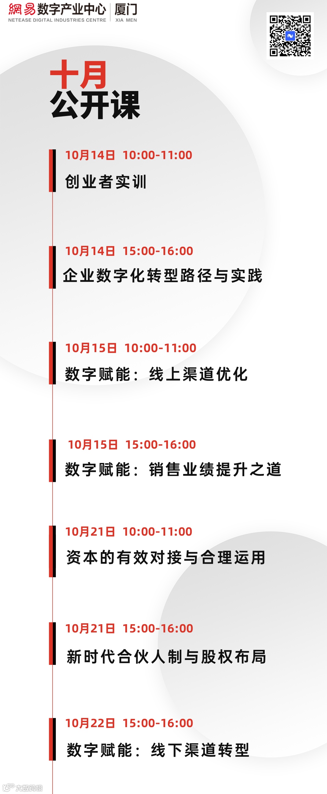 导读:为更好的服务园区入驻企业精进企业员工业务能力网易厦门数字产业中心十月公开课课程安排如下扫描图中二维码登录平台