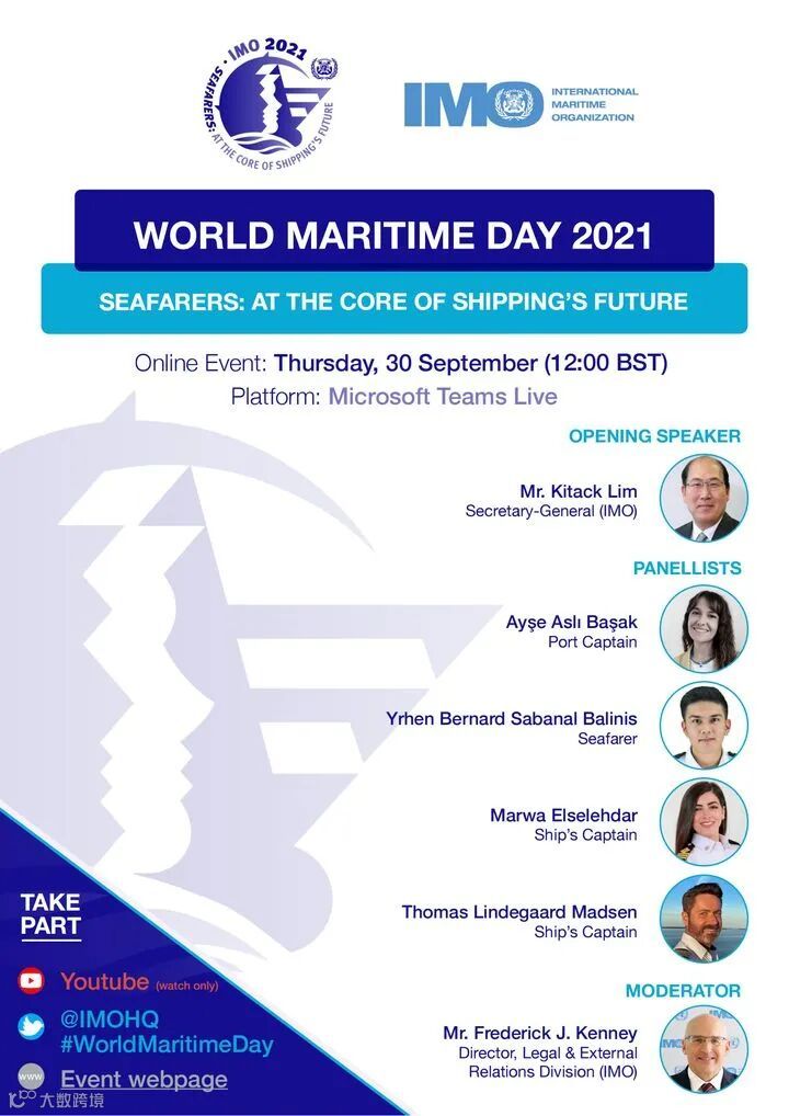 2021年世界海事日的日期定在9月30日,在这一天,国际海事组织将于北京时间19:00举办一场网络研讨会,会议主题为“海员:航运业未来的核心”。除了听取秘书长林基则(Kitack Lim)的发言外,与会者还将听取四位海员关于以下主题的发言:多样性、安全、船员换班和环境。