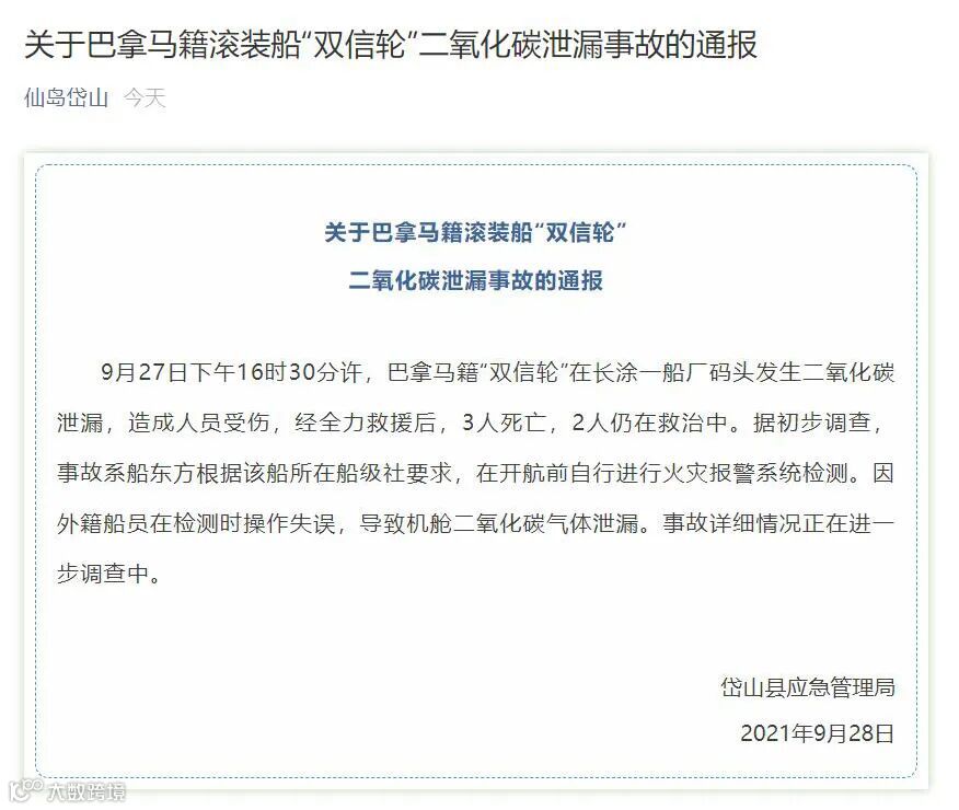 9月27日下午16时30分许,巴拿马籍“双信轮”在长涂一船厂码头发生二氧化碳泄漏,造成人员受伤,经全力救援后,3人死亡,2人仍在救治中。据初步调查,事故系船东方根据该船所在船级社要求,在开航前自行进行火灾报警系统检测。因外籍船员在检测时操作失误,导致机舱二氧化碳气体泄漏。事故详细情况正在进一步调查中。