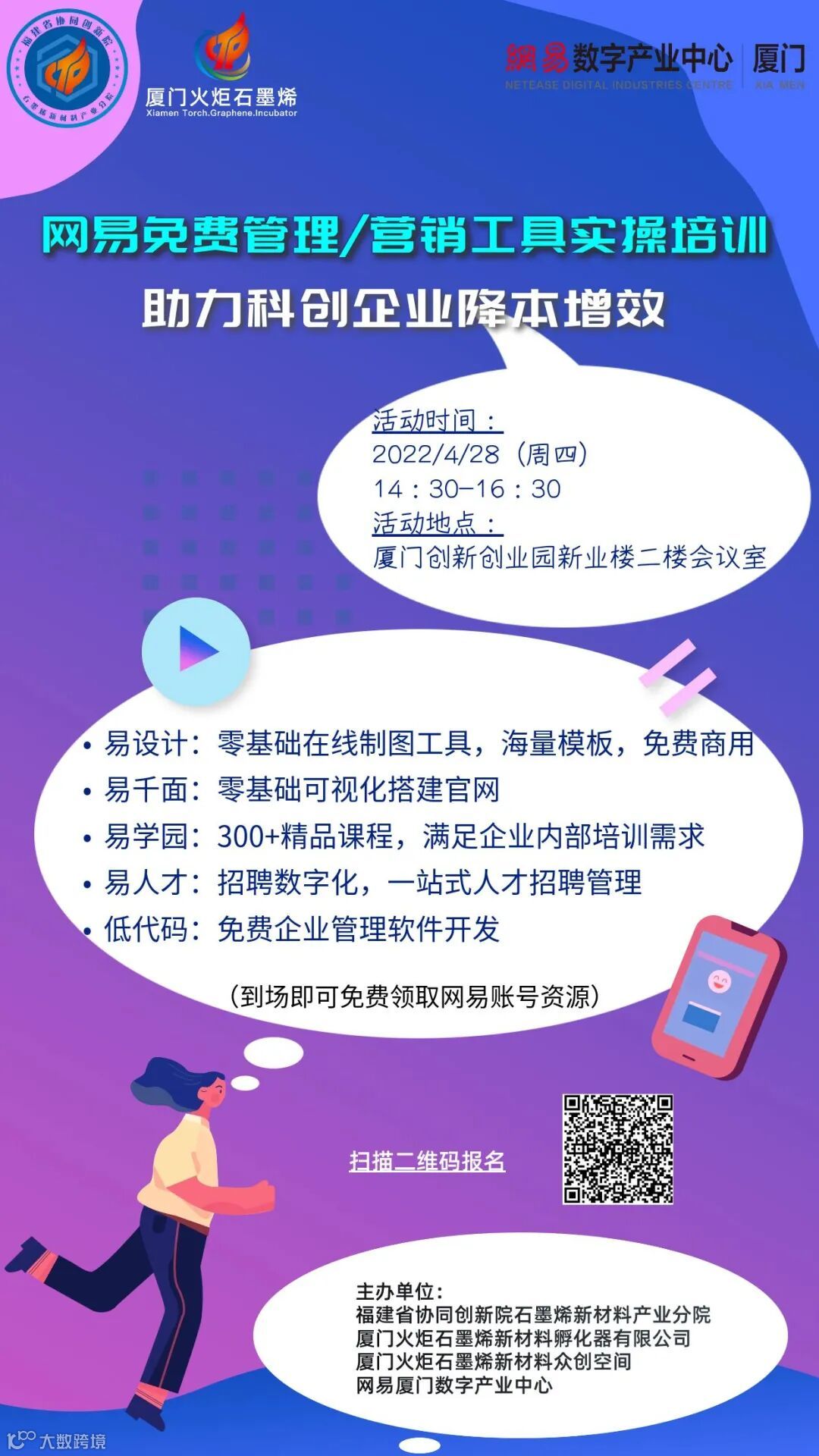 4月28日(周四)下午14:30,火炬石墨烯与网易厦门数字产业中心将在厦门创新创业园新业楼二楼会议室联合主办《网易免费管理/营销工具实操培训》线下活动。为企业现场讲解网易数创数字产品及服务平台,帮助企业应用数字化,提升和优化内部管理驱动业务增长,增强企业生存能力。