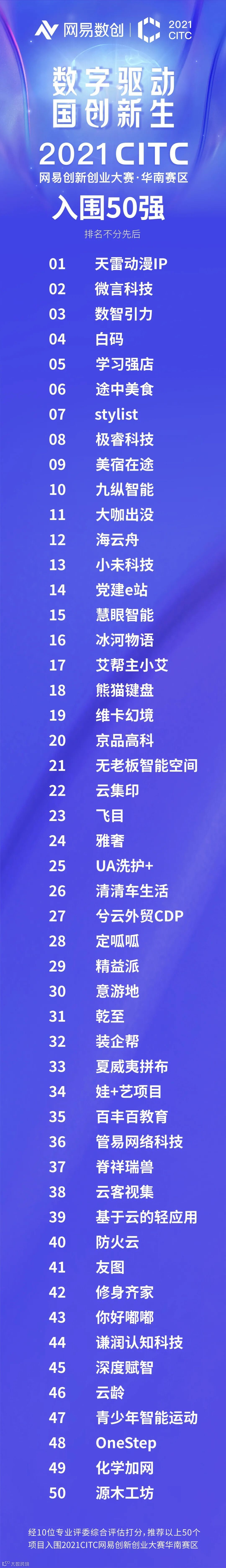 恭喜以上项目入围,10月13将继续公布华南赛区20强名单!评选结果请关注网易厦门数字产业中心公众账号。