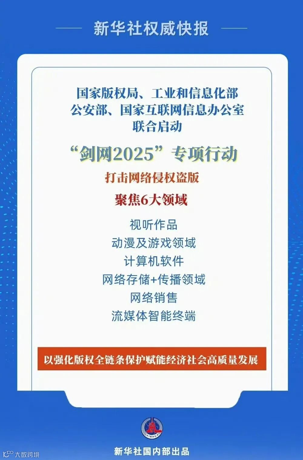 近日,国家版权局、工业和信息化部、公安部、国家互联网信息办公室四部门联合启动打击网络侵权盗版“剑网2025”专项行动,这是全国持续开展的第21次打击网络侵权盗版专项行动。