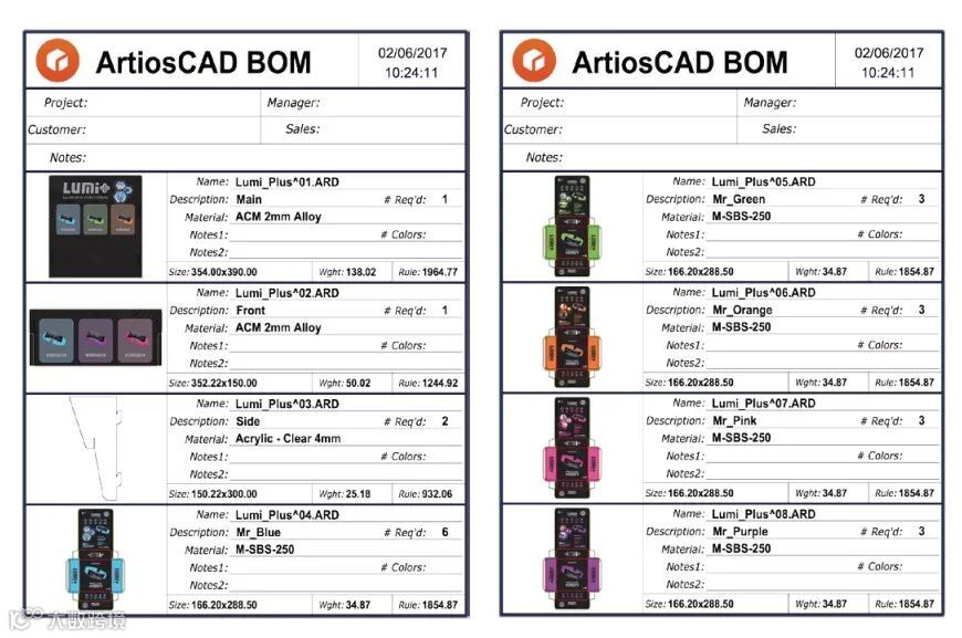 为了跟踪复杂包装或者多部件展示的不同部件,ArtiosCAD会自动生成全面的物料清单(BOM)报告单。