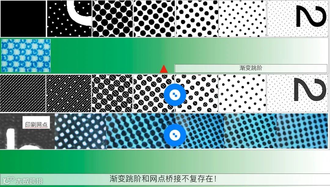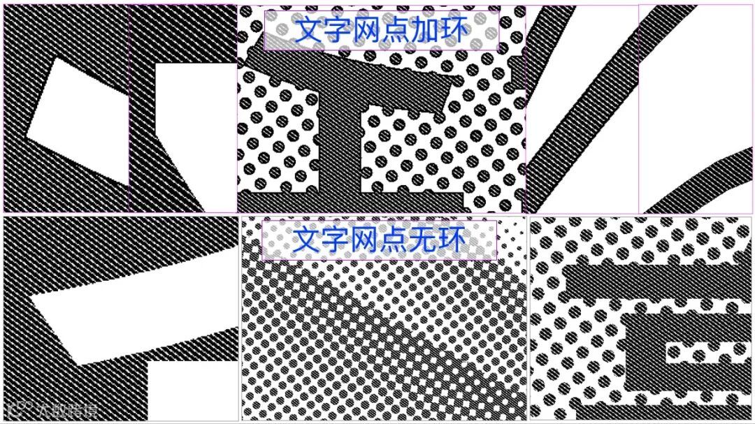 我们通过对网点的二次处理加网,让网点上面出现沟槽和边环,但实际在制版时这些沟槽和边环时洗不出来的,这样的结果只会让每个网点出现形状不一致,如上图的印刷网点结果,而这样的处理就可以减少墨杠减跳阶的问题。