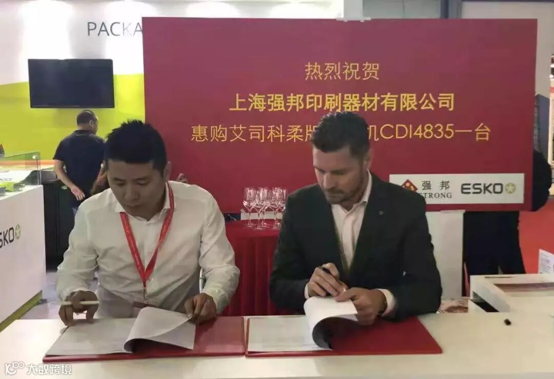 2018年10月26日,在人头攒动的上海全印展现场,N1展馆的艾司科展位处,上海强邦印刷器材有限公司柔版事业部负责人郭俊毅副总经理及艾司科贸易(上海)有限公司总经理Bjorn Willems进行了隆重的签约仪式。