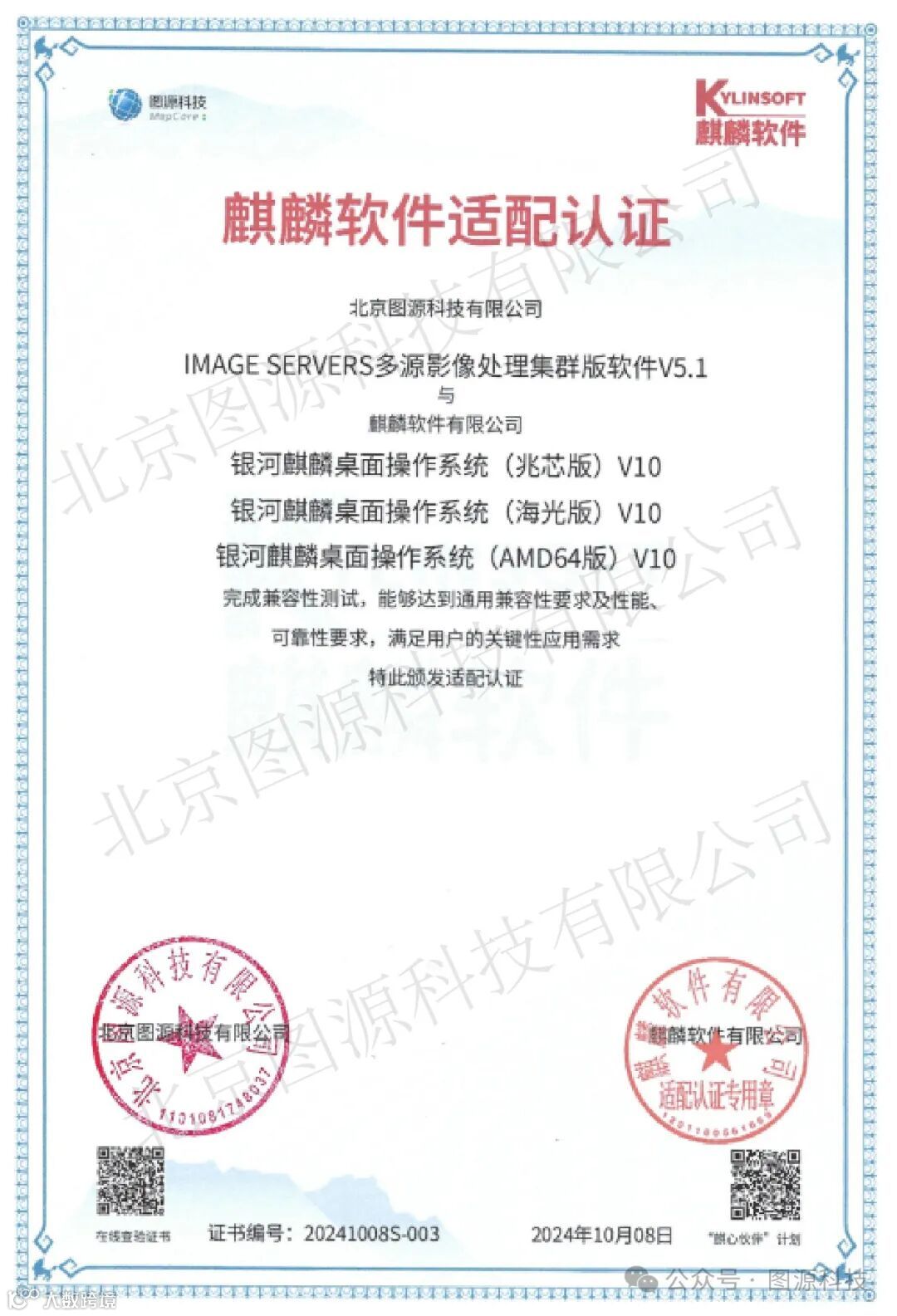 近日,我公司旗下的2款软件系统IMAGE PS多源遥感影像智能处理系统V5.1和IMAGE SERVERS多源影像处理集群版软件V5.1,与麒麟软件有限公司的银河麒麟桌面操作系统(兆芯版)V10、银河麒麟桌面操作系统(海光版)V10、银河麒麟桌面操作系统(AMD64版)V10完成兼容性认证,获得“麒麟软件适配认证”证书。经过双方共同的严格测试,能够达到通用兼容性要求及性能、可靠性要求、满足用户的关键性应用需求。