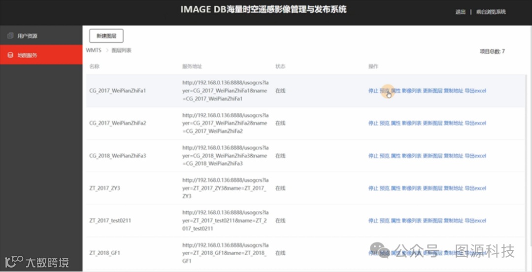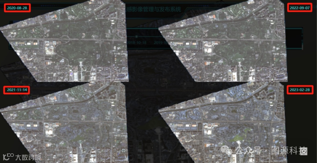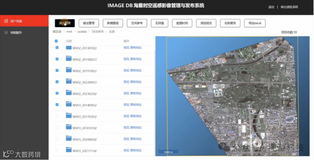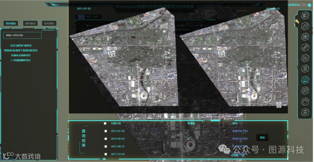 系统管理端具有全方位、立体化的数据服务管理功能,能将不同项目、不同测区、不同分辨率、不同时相的影像(分幅、整景) 一键式免切片入库,对入库影像背景颜色剔除、真彩色或假彩色显示、空间地理参考、入库数据名称与时间、存放路径导出等进行相关设置,实现遥感影像数据即时可视化管理并查看其相关属性信息。针对需要发布的影像数据,抽取所需的元数据内容,并实现同步更新,进行单景、一张图或多时相影像等发布服务。