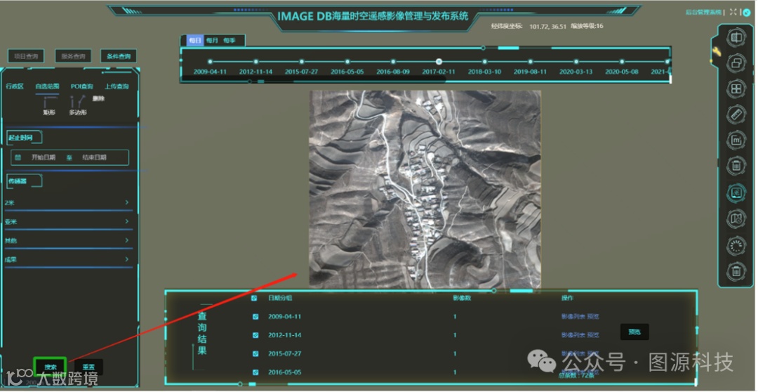 系统浏览端提供影像数据的动态搜索与无损画质浏览服务,能将发布的影像基于时间演变依次铺设在一条时间轴上,当点击时间轴上某个节点时,浏览视图下方“查询结果”中将自动化过滤好符合该节点条件的影像数据。系统具备影像查询检索功能(基于项目、服务、单一/组合条件),提供卷帘工具,支持同一测区的不同时相的影像进行对比浏览与分析,能够对影像中的目标物进行距离与面积量测,实时显示测量结果。