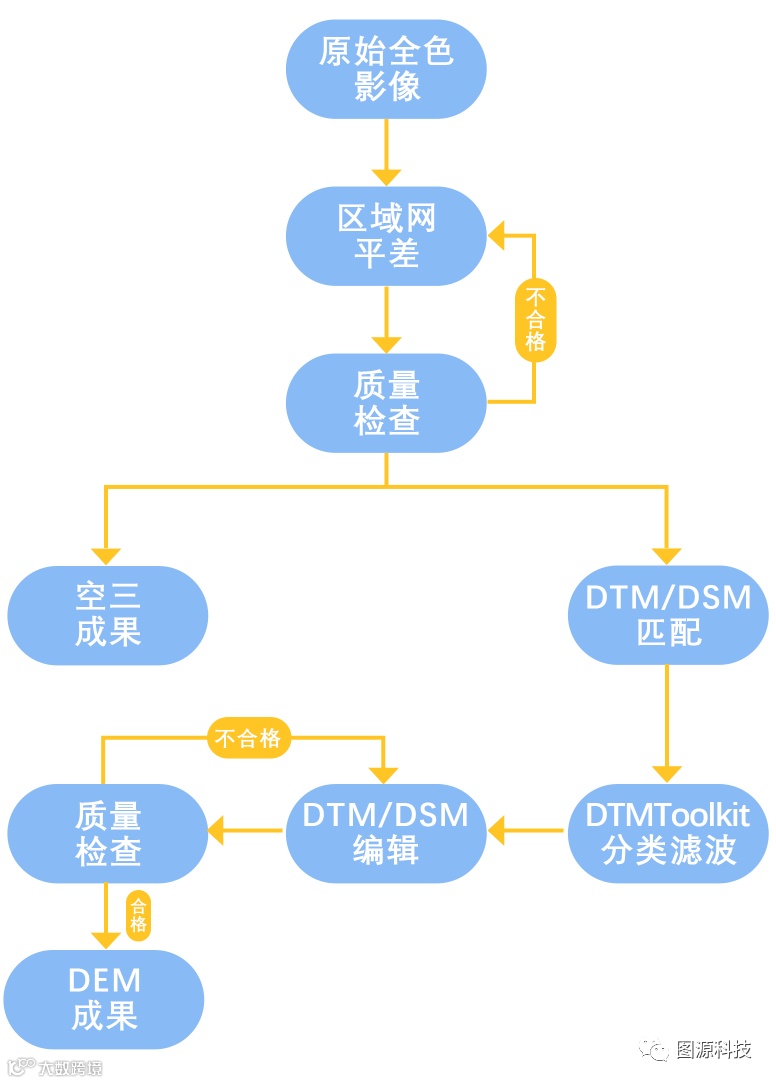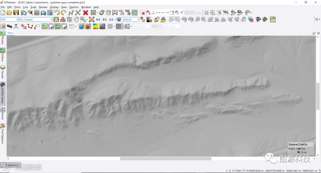 采用InphoV13软件,通过参考30mDEM数据和1m的DOM影像数据,获取参考控制信息,用于辅助空三解算,可以提升空三的精度。通过DTM的编辑和质检,最终生成一个高精度DEM成果。
