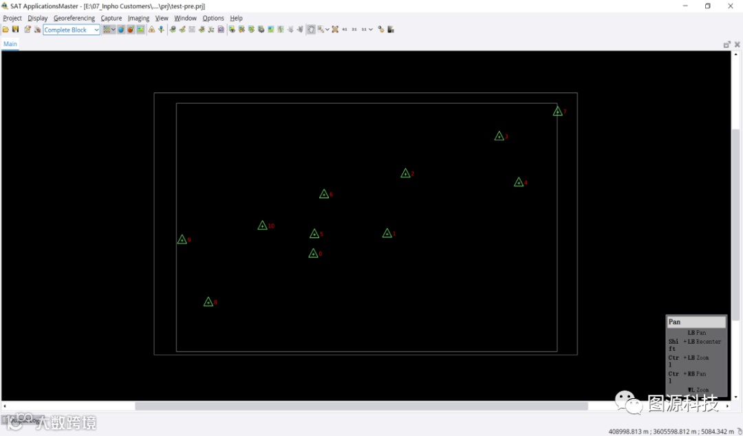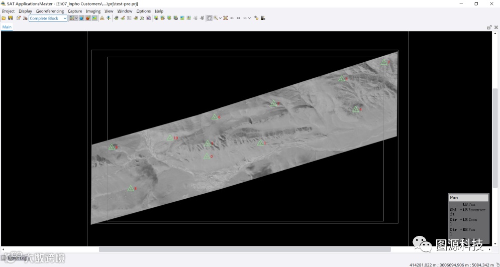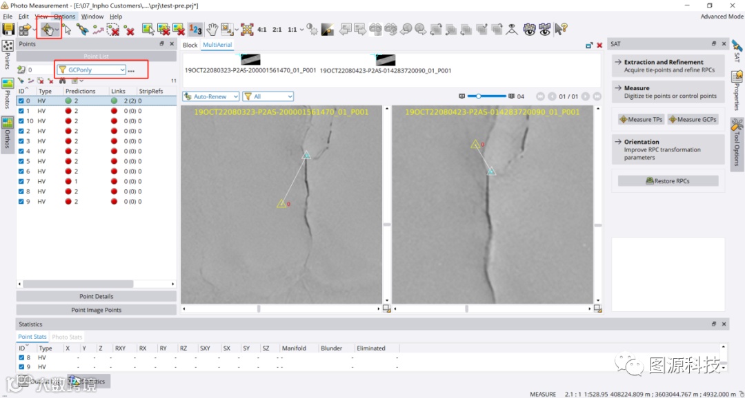 (2)在Match-AT卫星三角测量分别选择每一个像控点,点击工具栏“测量”工具,对选择的每一个控制点进行控制点量测,然后点击保存,选择提取等级进行空三加密。