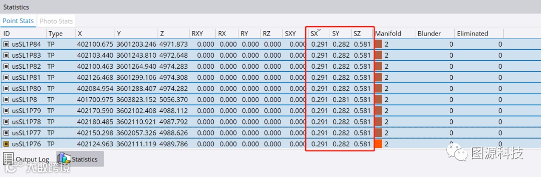 系统统计的所提取的连接点标准差SX:0.285~0.291,SY:0.281~0.282,SZ:0.581~0.584。