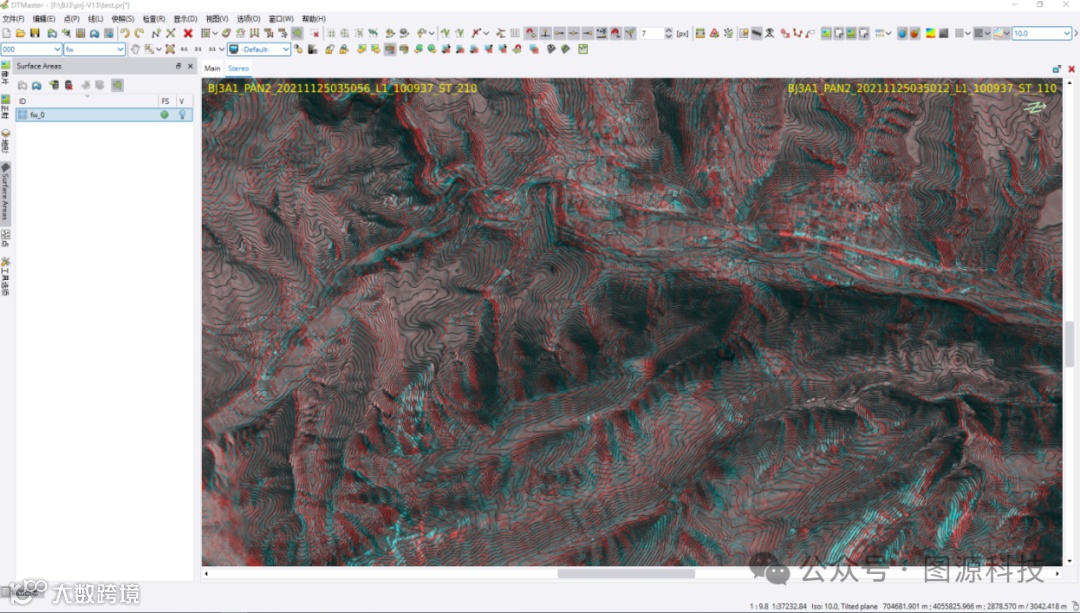 启动Inpho Match-T DSM模块,根据事先分析的工程中的地形地貌(山地、平地、起伏、极端),选择相应的提取策略,进行数字表面模型DSM提取。