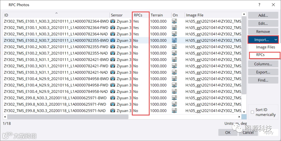 (4)检查导入的影像数据,如果RPCs列显示“Yes”则是软件自动识别资源3号的*.rpb文件。如果RPCs列显示“No”,则需要手动选择加载的每一幅影像,然后从导入选项中,加载相对应的*.rpb文件。