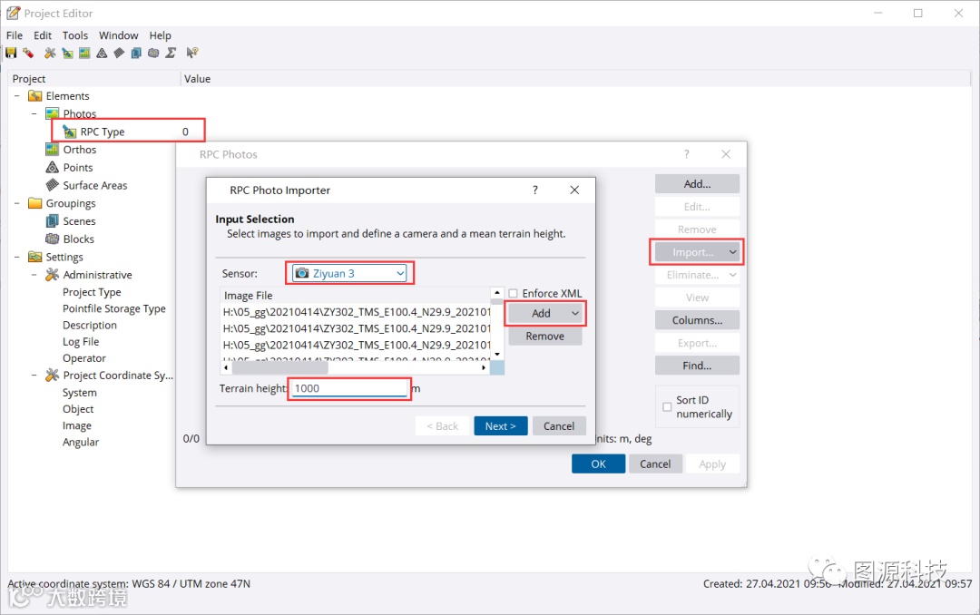 (3)点击RPC类型选项,选择资源3号传感器,将卫星影像数据加载至Inpho工程中,并设置测区平均地形高。