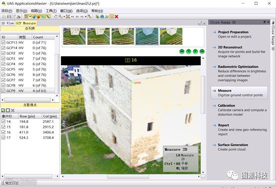 点击“测量/Measure”进入控制点量测界面。鼠标左键测量控制点,预测到的像片很多,选择适合的像片刺点,边缘和模糊的点不刺。