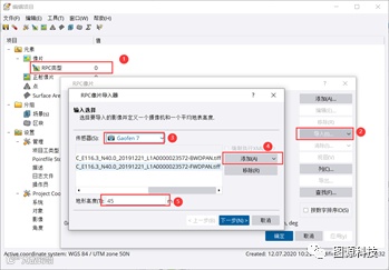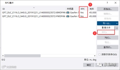 (3)检查导入的影像数据,如果RPC一列显示“Yes”则是软件自动识别高分七号的*.rpb文件。如果RPC一列显示“No”,则需要手动选择加载的每一幅影像,然后从导入选项中,加载相对应的*.rpb文件。