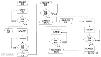 原始高分七号卫星立体像对影像数据包含全色影像与多光谱影像,由于全色影像分辨率高,先基于全色立体像对影像进行空三加密与DTM提取,然后在此基础上进行全色影像正射校正处理,基于校正后的全色正射影像对多光谱影像数据进行校正,最终将校正后的全色影像与多光谱影像融合与镶嵌匀色。具体的数据处理流程如下图所示。