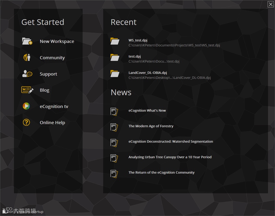 软件中不同工具的易用性和可访问性得到了彻底的提升。当启动eCognition时,用户首先会看到一个启动界面,这个界面可以快速访问eCognition软件相关资讯,软件资源和最近的工作空间。现在工作空间是标准组织环境,它提供批处理的直接访问,以及用于交互生成子集和贴切片的强大数据管理工具。菜单和工具栏也都重新经过优化和简化,以减少鼠标漫游路径和点击次数,可以更容易地找到最常用的工具。
