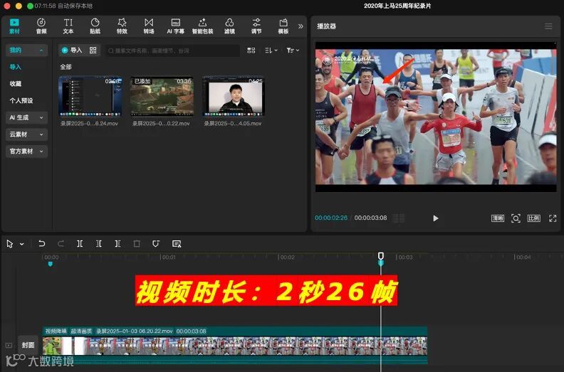 2025年年初,厦门马拉松博览会上,我也应邀做了一个主题的分享,分享的主题就是:“ 如何用影像为选手创造价值?如何为赛事品牌创造价值?为什么要做这样的一件事?” 我还特意把上马冲线的镜头下载下来,截取片段,放到剪辑软件上看了一下,这个镜头的时长是:“ 2秒26帧 ”。