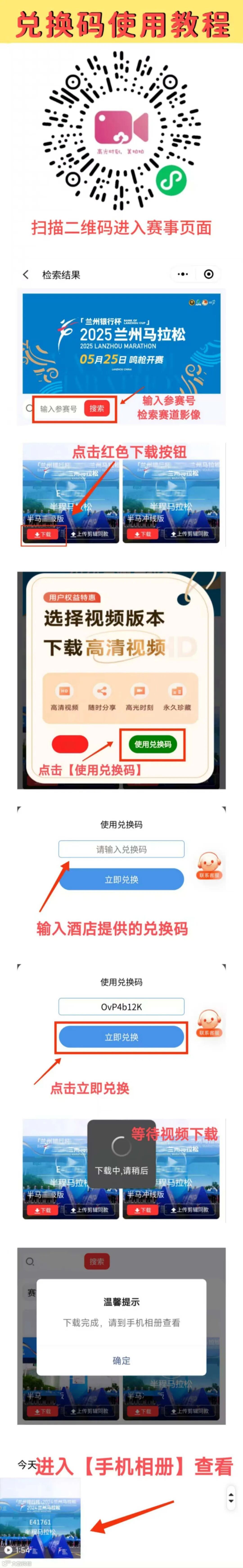选手拿到兑换码,等待赛后视频制作,出片完成后,可扫码进入美拍拍智能影像小程序,输入参赛号检索个人视频,下载时选择使用兑换码下载,输入酒店提供的兑换码即可保存至相册,详情可参考下方教程。