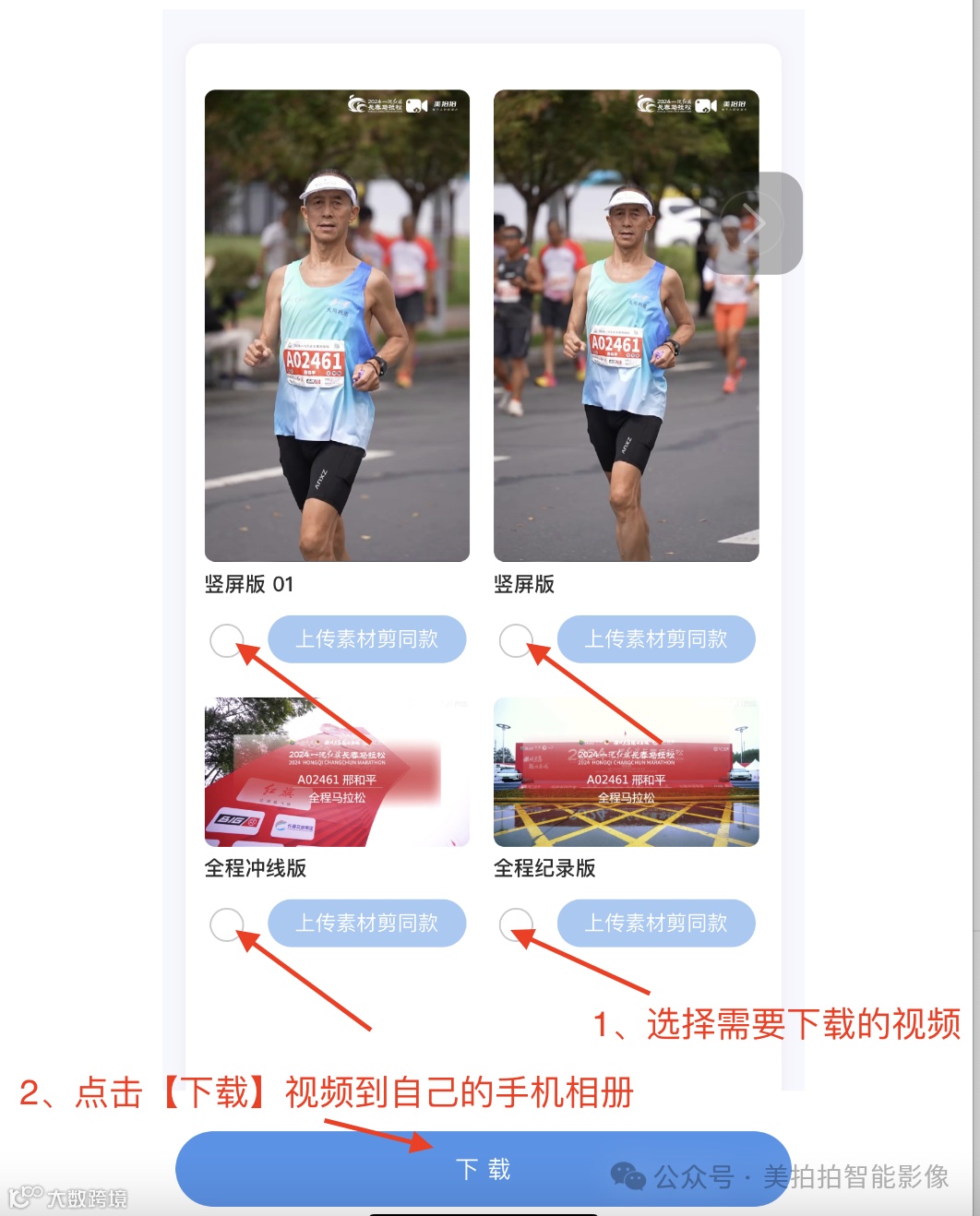 美拍拍个人视频已经做好,等着你领取!这些视频记录了你在长春马拉松赛场上的每一个精彩瞬间,从起跑时的坚定眼神,到冲刺时的全力以赴,每一个画面都充满了力量和感动。它不仅仅是一段影像,更是你人生中的宝贵回忆。当你回首这段经历时,视频中的自己将再次点燃你心中的激情,让你感受到坚持和努力的价值。它也是你向亲朋好友分享荣耀的最佳方式,让大家一同见证你的成就。