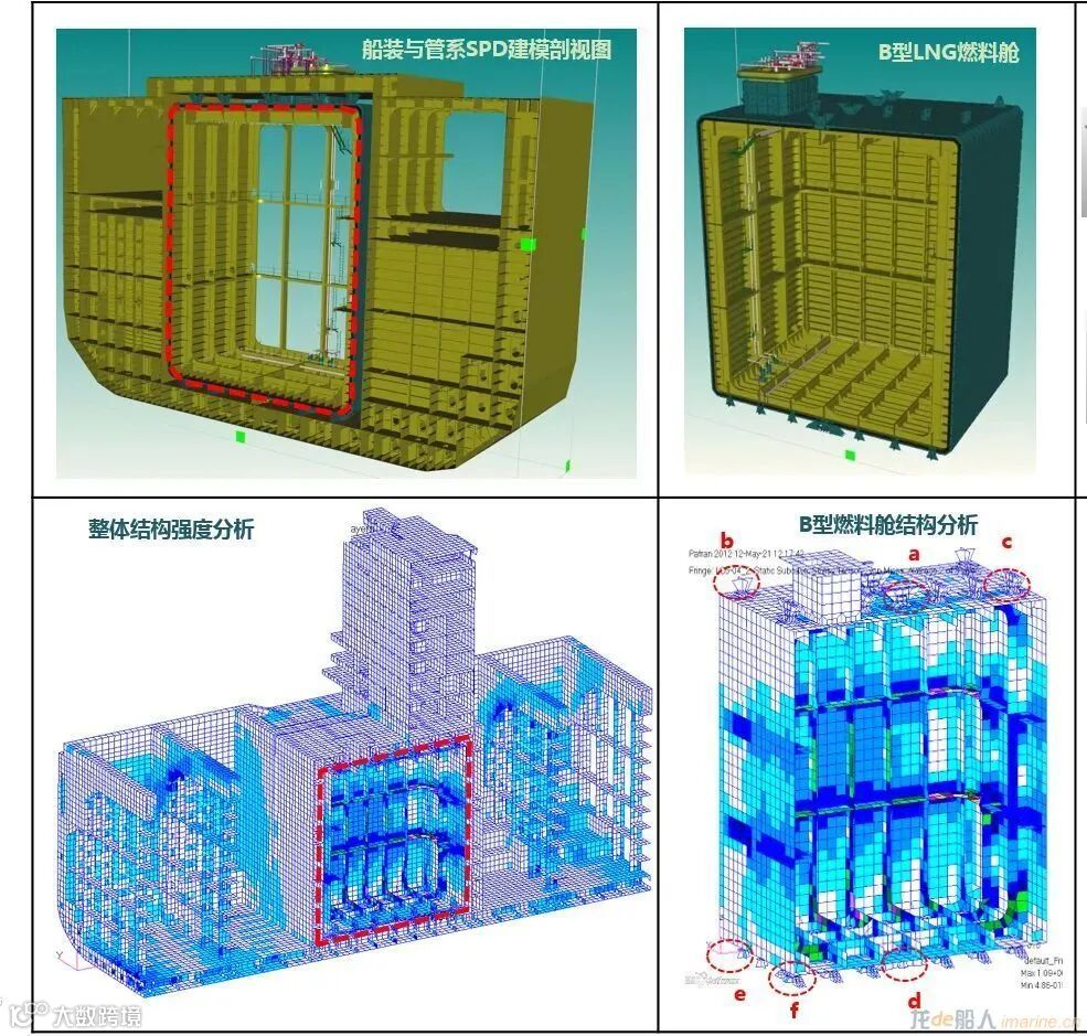 按照国际海事规则的分类,B型舱是部分次屏蔽的独立型液货舱。B型舱采用耐低温的金属厚板构造为第一层完整的主屏蔽舱体,舱外部安装隔热绝缘模块,基于复杂的疲劳裂纹扩展分析,在可能出现裂纹泄露的区域设置次屏壁实现安全可靠的LNG储存。打个形象的比喻,C型罐是“单层铠甲”, A型舱是“双层铠甲”,B型舱是“1层半铠甲”,在独立舱型中是既能做大舱容,又能够材料轻量化的舱型,非常适用于LNG燃料舱和中小型LNG运输船。