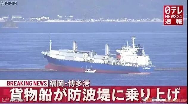综合日媒报道,当地时间28日晚,日本福冈博多港的西防浪堤坝北灯塔附近发生事故,一艘巴拿马籍的货船撞上了防浪堤,导致船头直接冲上堤坝,整个船身无法动弹,并已经开始漏油。