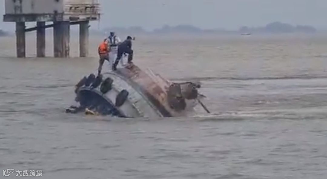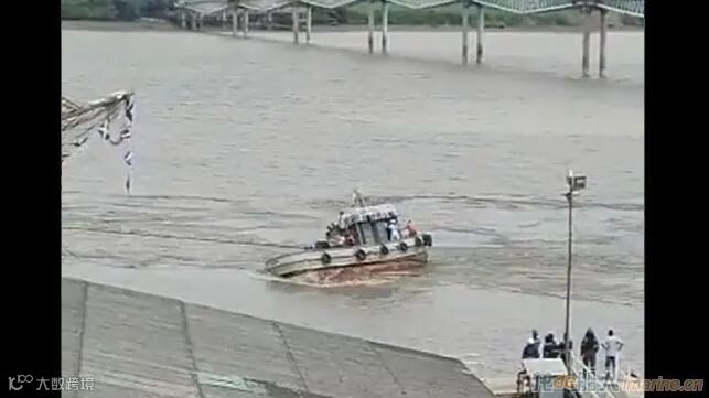 可以看到,当大拖船将白天鹅号拉离桥梁后,小拖船被缆绳拖曳住,失去重心并侧翻沉没。