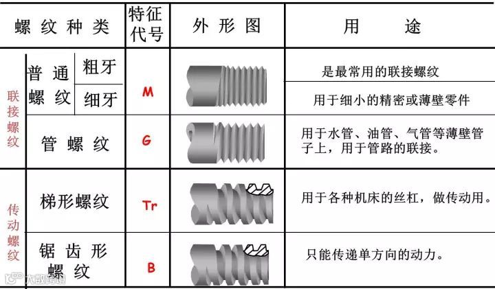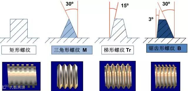 按牙型可分为三角形、梯形、矩形、锯齿形和圆弧螺纹;