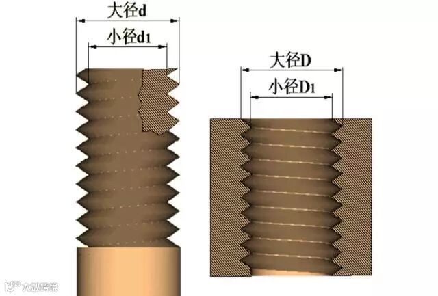 螺纹有大径(d、D)、中径(d2、D2)、小径(d1、D1),在表示螺纹时采用的是公称直径,公称直径是代表螺纹尺寸的直径。