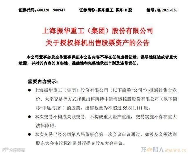 振华重工在公告中称,为促进公司股东价值最大化,合理配置资产结构,公司拟通过集合竞价、大宗交易等方式择机出售所持中远海控的股票,出售数量为不超过5561.11万股。