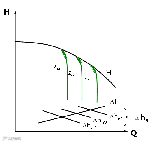 ▲不同的吸高Zs(Zs3 >Zs3 > Zs3),吸高Zs越大,有效汽蚀余量Δha越小,断裂工况向小流量的方向移动,不发生汽蚀的流量范围越小。