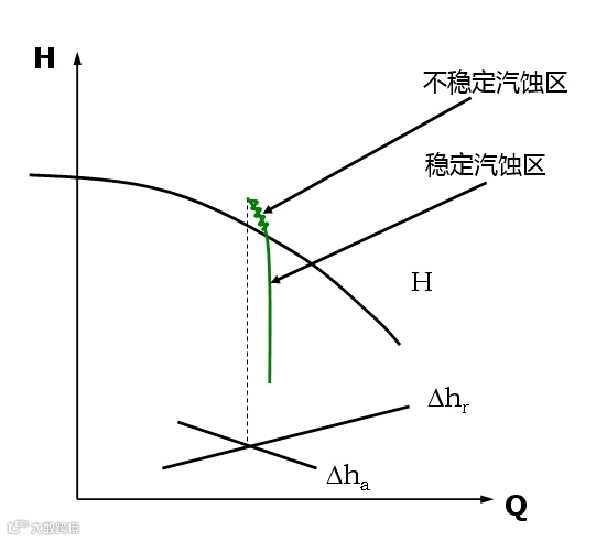 ▲当有效汽蚀Δha降到低于必需汽蚀余量Δhr时,产生噪音、振动、压头明显降低,称不稳定汽蚀区。