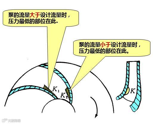 1、当泵的流量大于设计流量时,液体撞击叶片背面,最低压力部位在叶片进口靠近前盖板的叶片正面上,如图K1处。