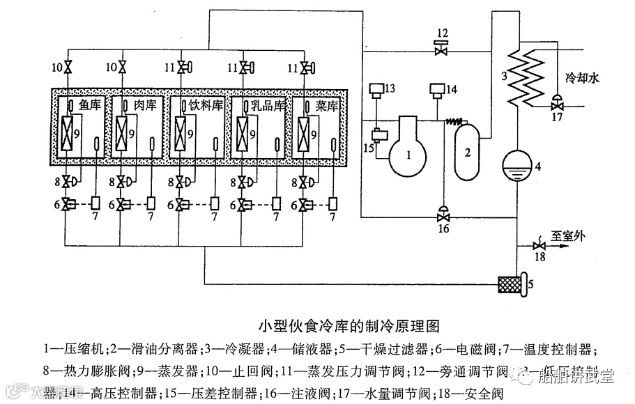 上图是典型船舶伙食冷库制冷系统原理图。它有两台压缩机。正常情况下一台工作,一台备用。该伙食冷库共分五个库,库温分别是菜库,(2±1)℃;乳品库,(2±1)℃;饮料库,(4±1)℃;鱼库,(-12±1)℃;肉库,(-12±1)℃。各冷库都采用绕片式蒸发器。