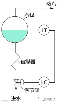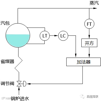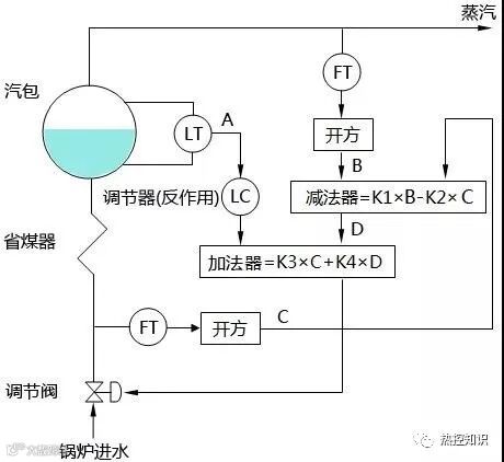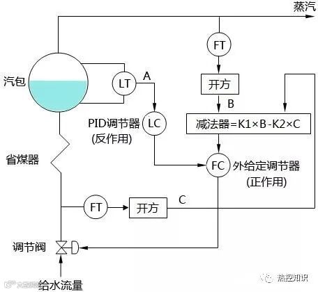 当水位由于扰动升高时,因LC反作用,它的输出下降进入运算器后,使FC给定值下降而输出增加,调节阀开度减小,给水量减少,水位也下降,直至回到设定值上达到新的平衡。当蒸汽流量增加时,FC给定值增加而输出减小,调节阀开大,给水量增加,保持水、蒸汽平衡,使水位不变。副回路克服给水自身的扰动,更进一步地达到自动控制,稳定水位的目的。