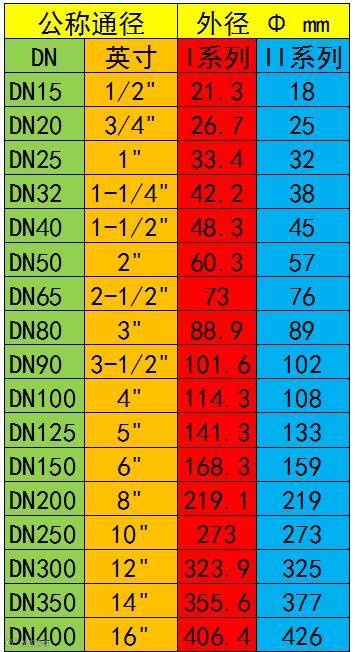 当然也有不一样的如3"*25=75这样四舍五入即DN80 还有一些带分号或小数点的英寸如1/2" 3/4" 1-1/4" 1-1/2" 2-1/2" 3-1/2"等,这些就不能那样算了,不过算也大致差不多,基本都是规定值: