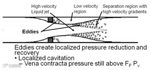 旋塞阀的气蚀破坏的预测更为复杂,不是简单地计算的阻流压降。经验表明,有可能是主液流中的压力下降到该液体的蒸气压为区域的局部汽化和蒸汽泡崩溃之前。 有些阀门制造商预测年初蚀破坏的通过定义一个初期损伤压降。 一个阀制造商的预测气蚀损坏的开始方法,是基于这样的事实,这是蒸汽气泡塌陷,导致空蚀及噪音。 厂商已确定,如果计算的噪音水平低于下列限制,将可避免重大气蚀破坏。
