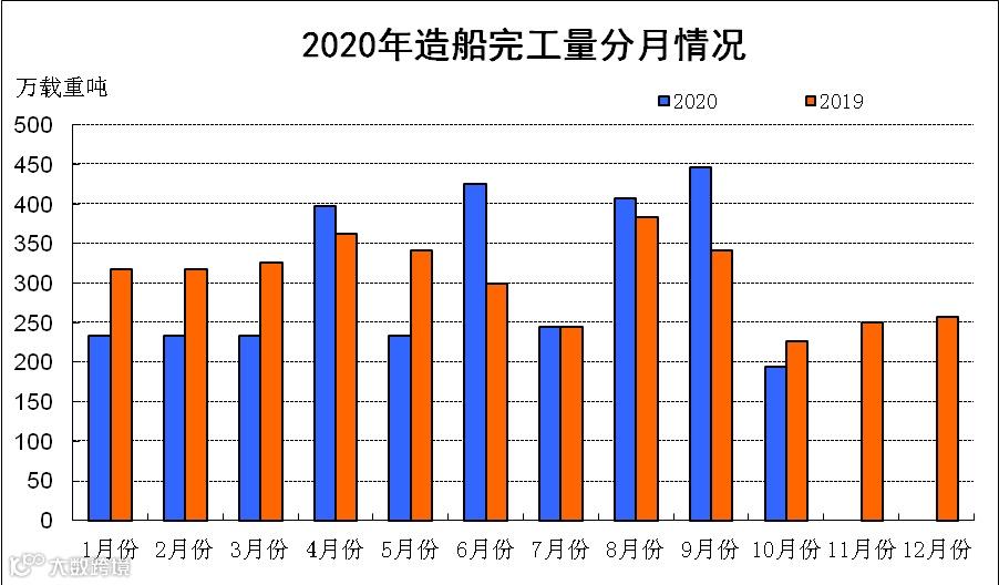 2020年1~10月份,我国新船订单降幅明显收窄,完工量和手持船舶订单量下降,重点监测企业主要经济指标同比下降。