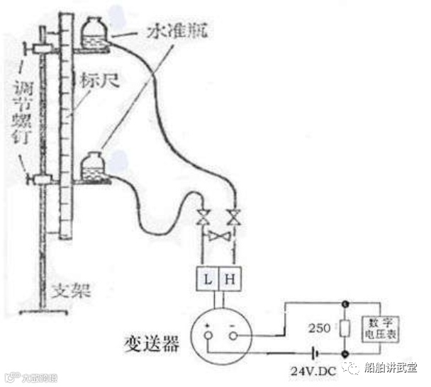 当液体密度恒定时,测出差压就就可知道液位高度,而与液体容积无关,或者说知道了液体高度,也就知道了差压,即△P=ρH。模拟校验法就是基于上述原理进行的。现以校验水位计为例,介绍一下具体方法,校验装置及接线如图所示: