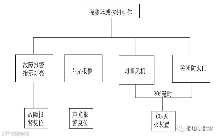 以上2动作完成后经20秒延时,CO2 灭火装置继电器KM6动作,启动灭火装置,准备救火。